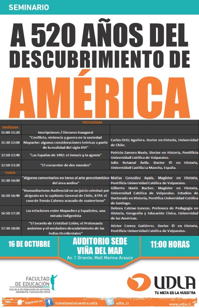 Programa seminario A 520 años del descubrimiento de América…. En auditorio UDLA, Viña del Mar, 16 de octubre….