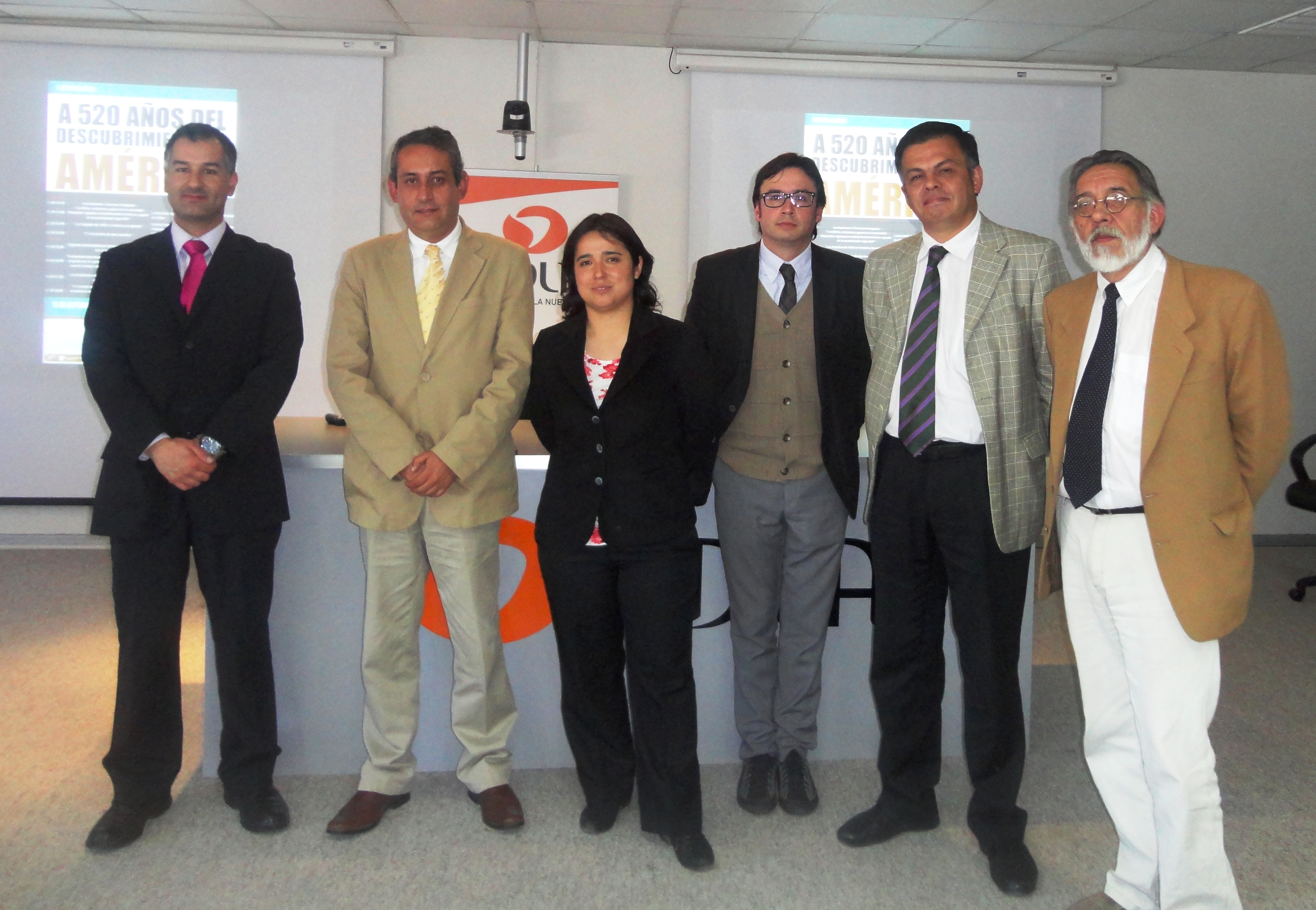 Ana Henriquez Orrego, Directora de Escuela de Pedagogía en Historia, Geografía y Educación Cívica junto a expositores del Seminario “A 520 años del Descubrimiento de América”, Mg. Matías Gonzalez, Dr. Carlos Ortiz, Dr. Patricio Zamora, Mg. Héctor Correa y Dr. Julio Retamal.