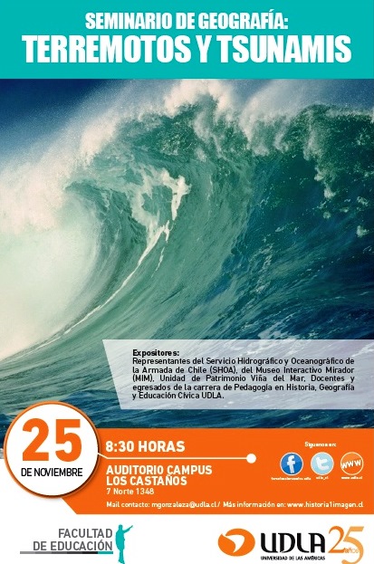 Junto con saludarles me dirijo a uds. para invitarles a participar del Seminario de Geografía «terremotos y tsunamis» a realizarse el 25 de noviembre en Auditorio de Campus Los Castaños Viña del Mar de Universidad de Las Américas.