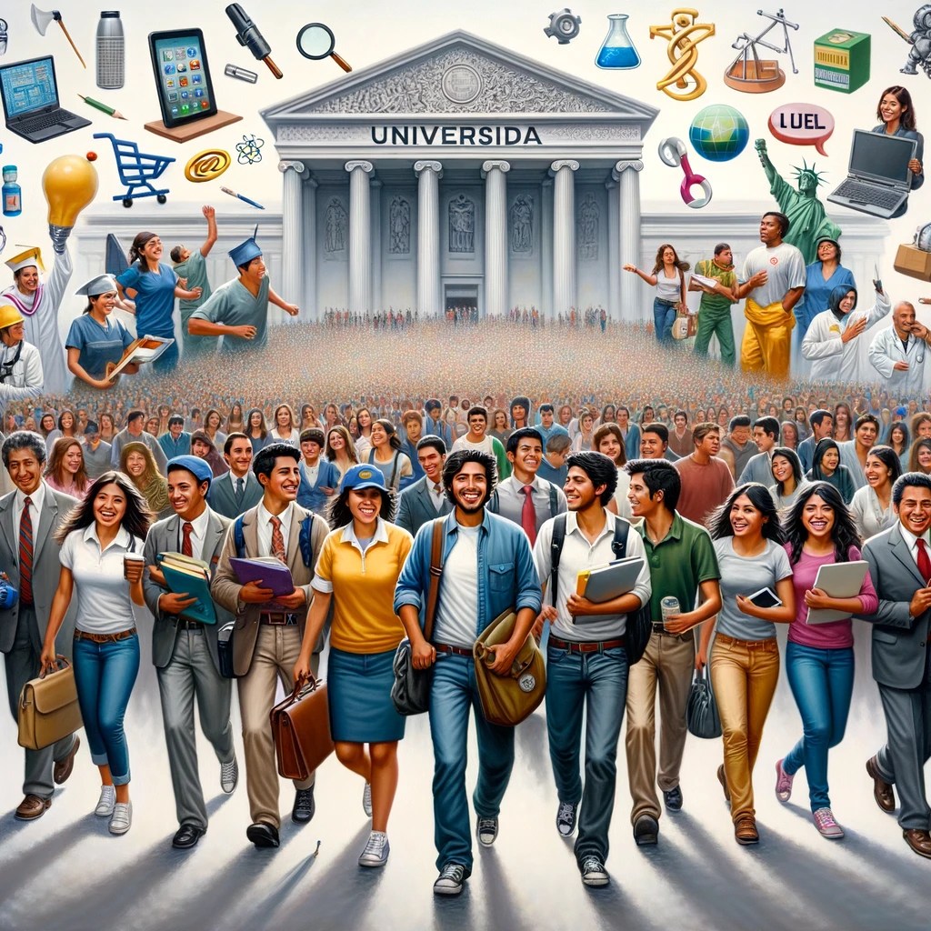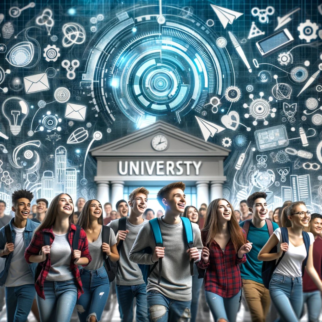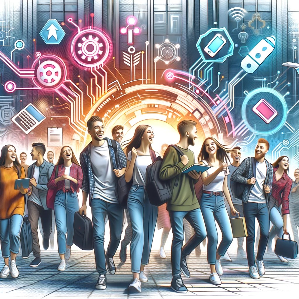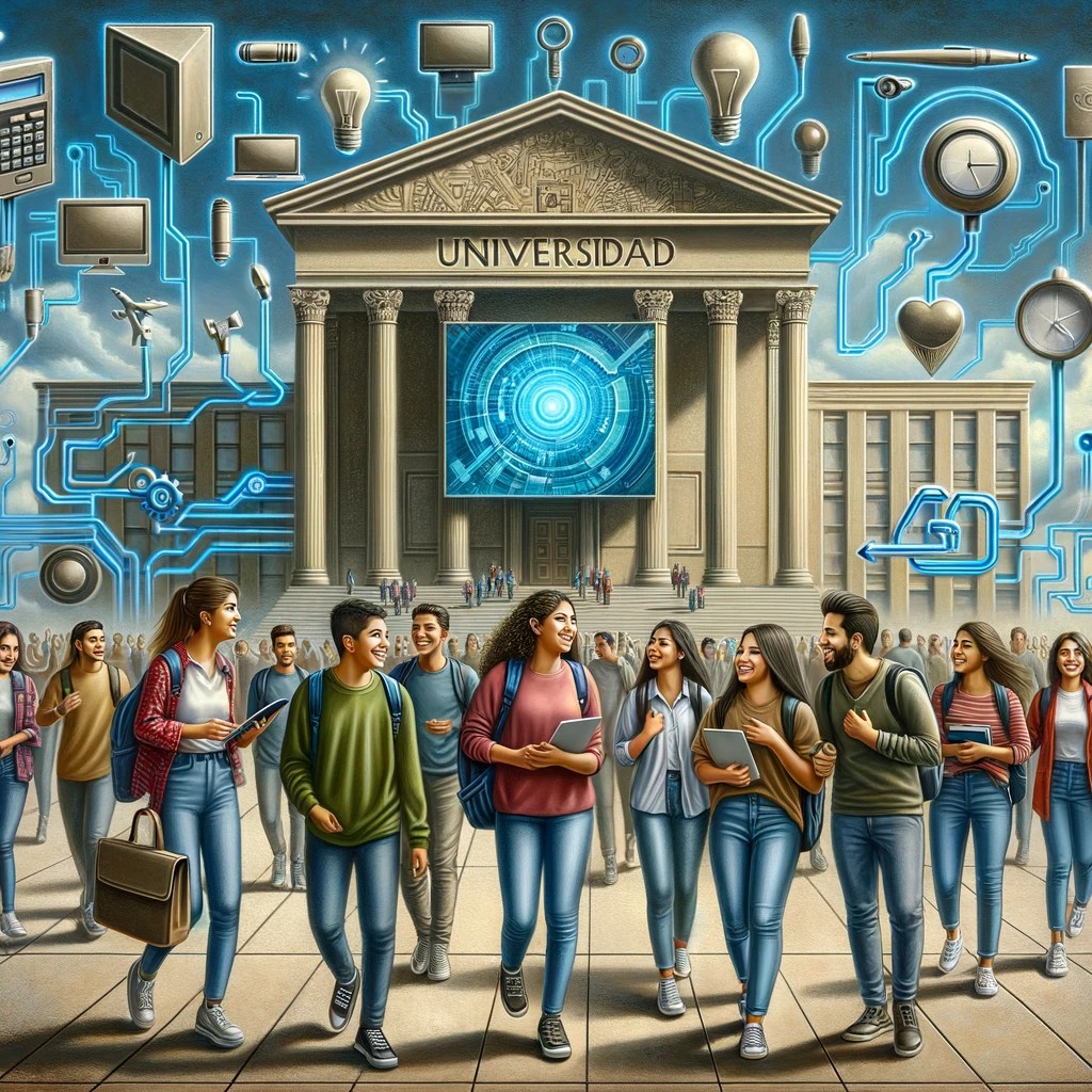 - Estudiantes universitarios saliendo de su casa de estudios + elementos tecnológicos en el ambiente.