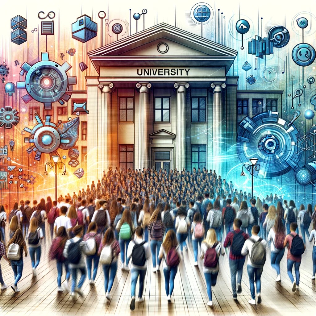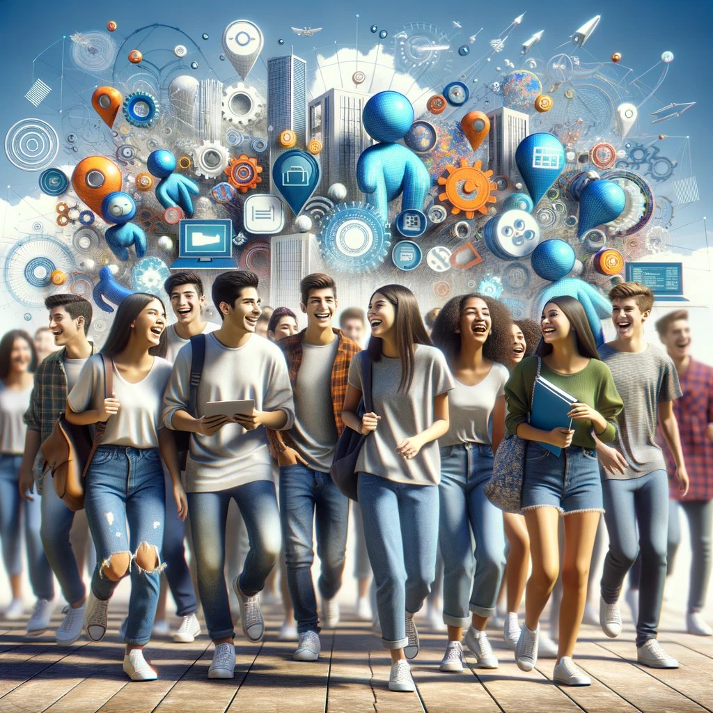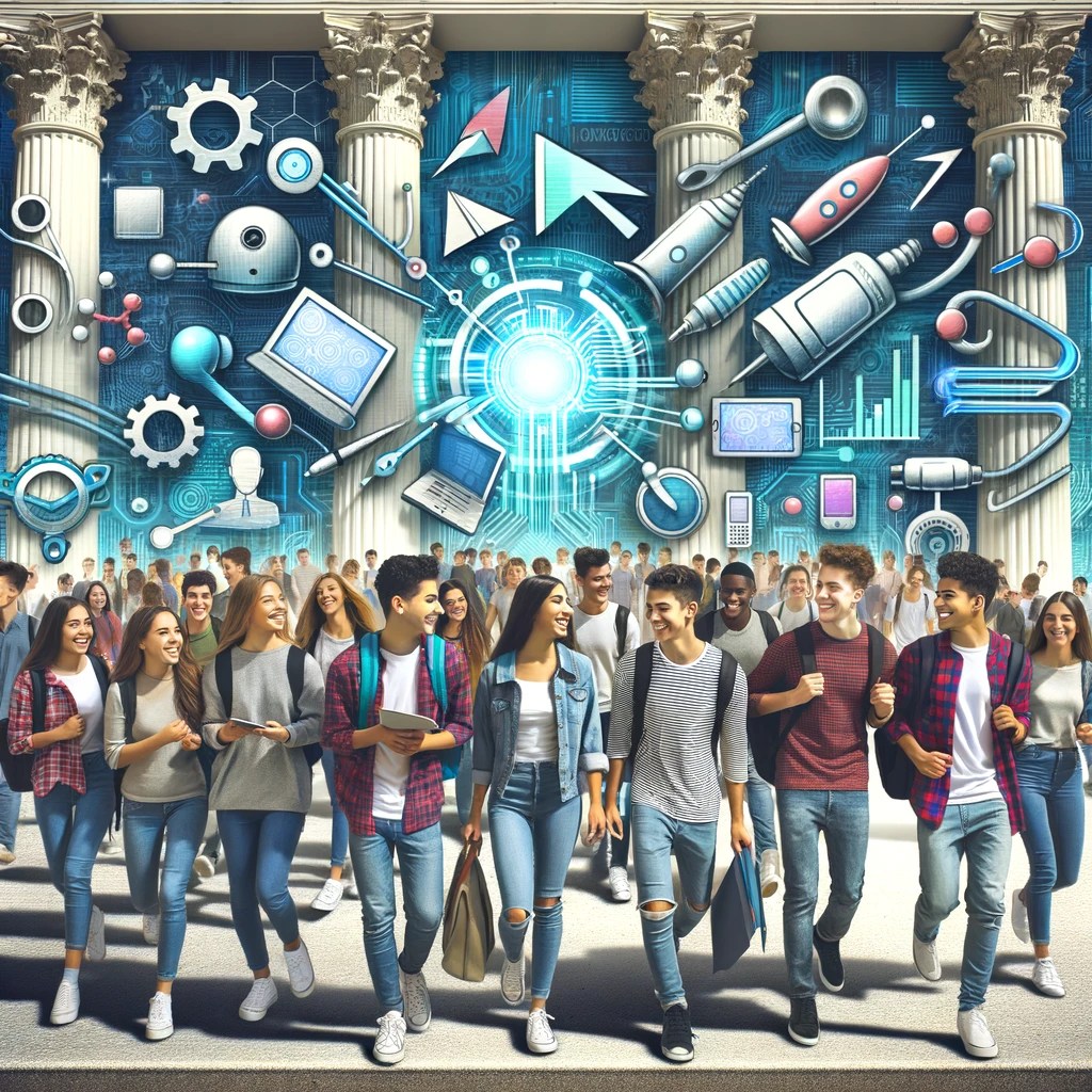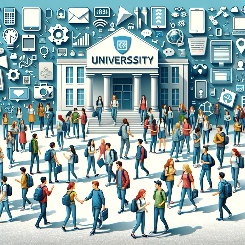 - Estudiantes universitarios saliendo de su casa de estudios + elementos tecnológicos en el ambiente.