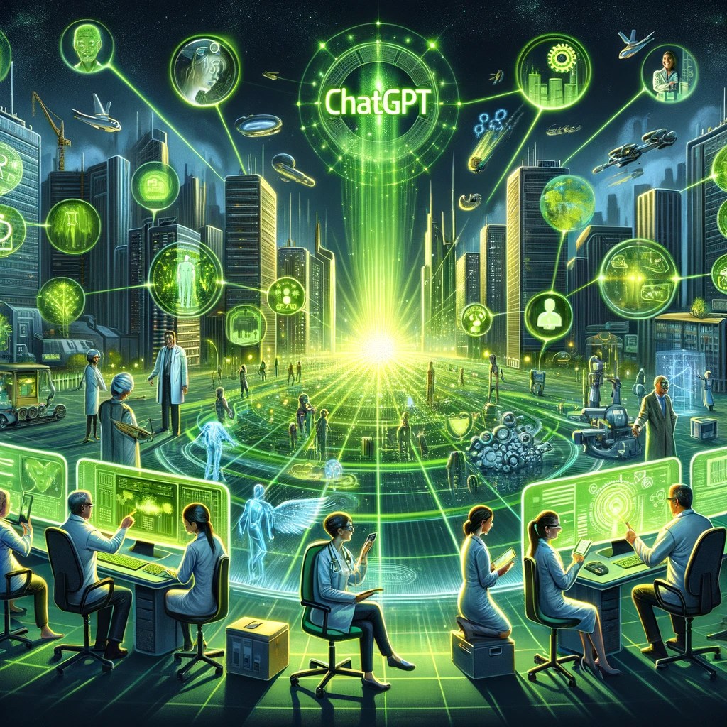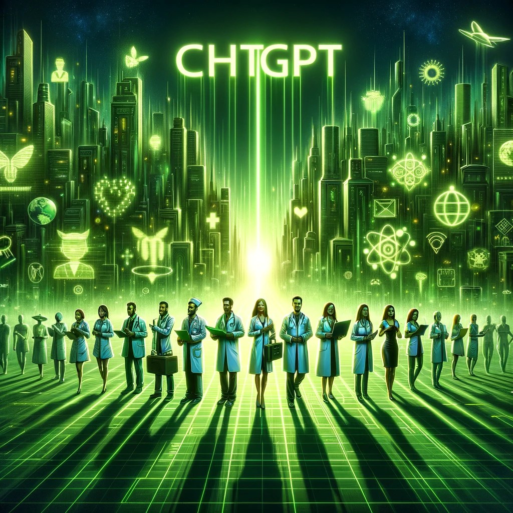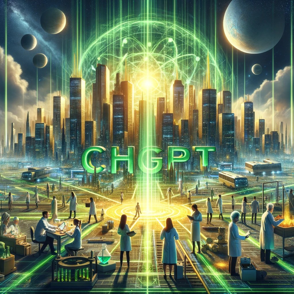 Este es un ejemplo de solicitud textual, que luego se modifica hasta lograra el deseado: «Una escena futurista donde la palabra ChatGPT actúa como un centro de energía radiante, iluminando y conectando a diversas personas con profesiones prototípicas. Las personas deben llevar vestimentas típicas de médicos, arquitectos, constructores, profesores, químicos, abogados, astronautas, psicólogos, kinesiólogos»; «NECESITO ESTO EN TONO VERDE. CON LA PALABRA COMPLETA DE CHATGPT Foto de un paisaje urbano futurista donde la palabra ‘ChatGPT’ brilla vibrantemente en el centro, actuando como una fuente de energía radiante. Rayos de luz emanan de la palabra, conectando e iluminando a diversos individuos de diferentes descendientes y géneros, cada uno simbolizando su ocupación: un médico con bata blanca y estetoscopio, un arquitecto con planos, un constructor con casco, un maestro sosteniendo una pizarra, un químico con tubos de ensayo, un abogado con documentos legales, un astronauta con traje espacial, un psicólogo con una libreta y un kinesiólogo con equipo terapéutico. El aura de ChatGPT significa su influencia e importancia en sus respectivas profesiones».