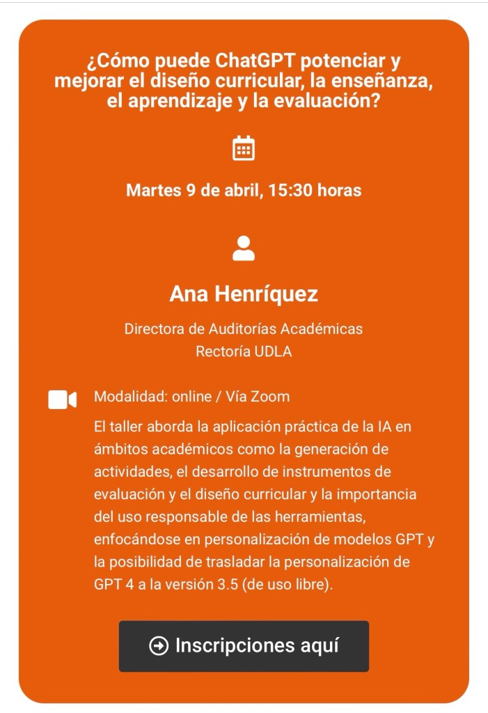 Este taller se centra en integrar la Inteligencia Artificial (IA) al quehacer académico en Educación Superior. Para esto aborda la aplicación práctica de la IA en ámbitos académicos como la generación de actividades, el desarrollo de instrumentos de evaluación y el diseño curricular y la importancia del uso responsable de las herramientas, enfocándose en personalización de modelos GPT y la posibilidad de trasladar la personalización de GPT 4 a la versión 3.5 (de uso libre). Se entregará certificado de participación a quienes se conecten y certificado de capacitación a quienes realicen la actividad práctica.