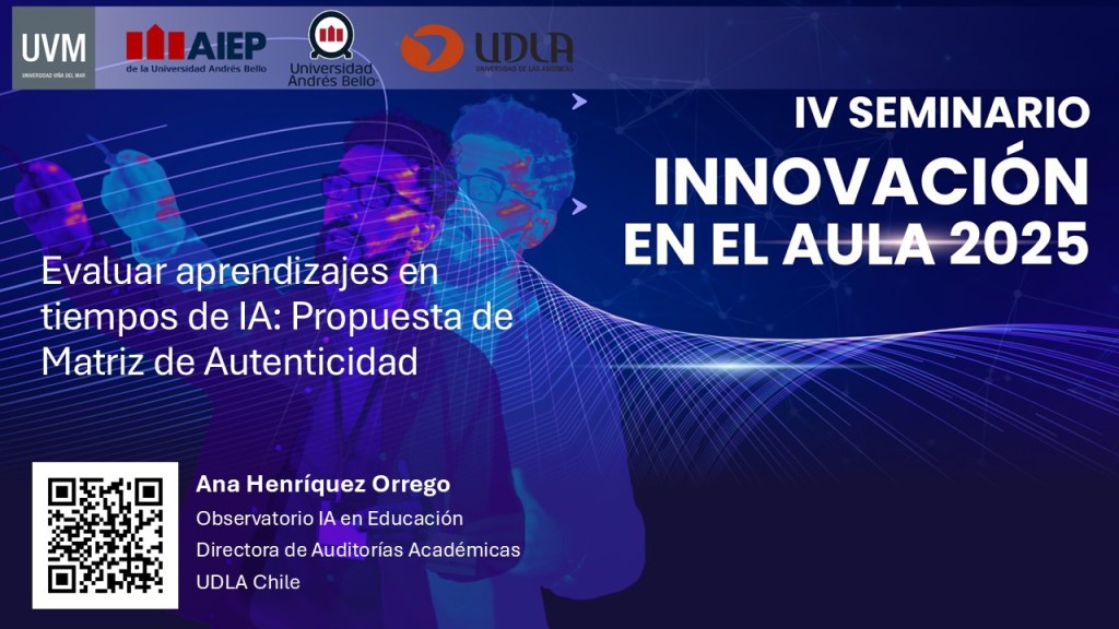 El 19 de noviembre participé como expositora en el Seminario de Innovación en el Aula 2025, donde presenté la ponencia “Evaluar aprendizajes en tiempos de IA: Propuesta de Matriz de Autenticidad”. En esta intervención abordé cómo la presencia creciente de la inteligencia artificial está modificando la forma en que estudiantes buscan información, producen textos y resuelven tareas, lo que exige revisar los enfoques evaluativos tradicionales. Expuse que la IA no debe entenderse solo como un desafío tecnológico, sino como un elemento que transforma el ecosistema formativo y hace imprescindible asegurar pertinencia, veracidad y profundidad en los aprendizajes.