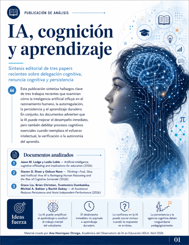 Conviene profundizar en los trabajos de Jason M. Lodge y Leslie Loble sobre delegación cognitiva e implicancias educativas; en la propuesta de Steven D. Shaw y Gideon Nave sobre el tercer sistema cognitivo y la renuncia cognitiva; y en la investigación de Grace Liu, Brian Christian, Tsvetomira Dumbalska, Michiel A. Bakker y Rachit Dubey sobre asistencia de IA, persistencia y desempeño independiente. Estos autores entregan una base robusta para una conversación que la educación ya no puede postergar: cómo enseñar a pensar con IA sin dejar de pensar.